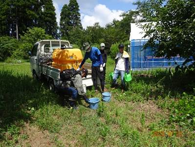 1.皆さんにバケツと如雨露で苗木に支援の水を届けてもらいました。