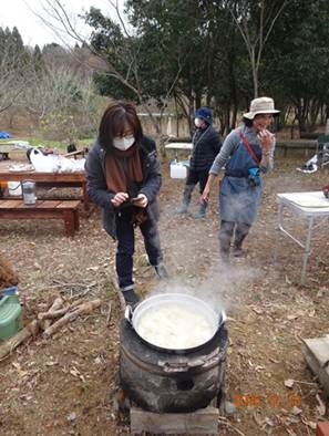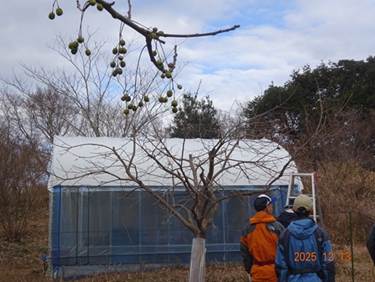 カキ、ウメ、クリなど枝打ちを行い、シイタケを採取しました。